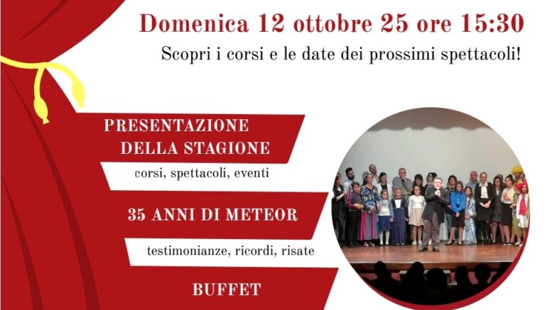 Anche quest’anno apriamo la stagione teatrale con la presentazione dei corsi METEOR35 si ricomincia! Domenica 12 ottobre 2025 ore 15.30 Scopriremo i corsi e le date dei nuovi spettacoli, rivivremo alcuni momenti…